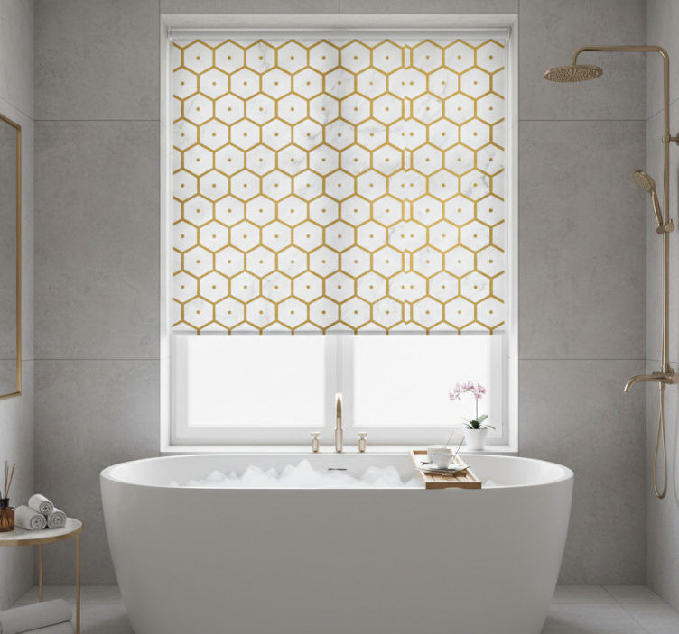Reference: E6176Transform your space with our stunning Bathroom blind in hexagonal gold marble pattern, a perfect blend of elegance and functionality. The eye-catching design features a luxurious hexagonal gold marble pattern that adds a touch of sophistication to any bathroom. This roller blind not only enhances the aesthetic appeal but also provides essential privacy and light control, making it an ideal choice for modern homes.