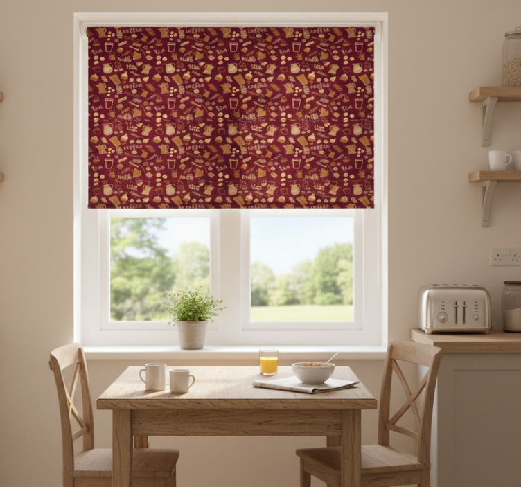 Enhance your kitchen's ambiance with the Beverage motif pattern blinds in a kitchen. These blinds serve as a fantastic decorative element, adding a playful touch while offering essential functionality. They beautifully complement your culinary space, making it a welcoming environment for family and friends. Let your personality shine through your decor!