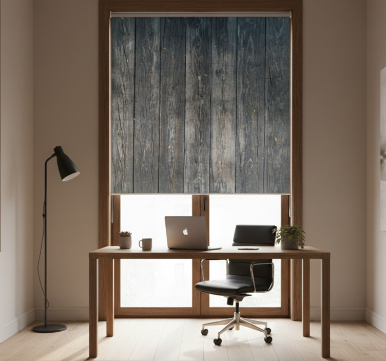 Transform your workspace with our Blind home office in gray distressed rustic design, a perfect blend of style and functionality. This roller blind features a charming rustic aesthetic that enhances your home office while providing essential benefits. With easy assembly in just 2 clicks, easy cleaning, and disassembly, it ensures that maintaining a tidy environment is hassle-free. Protect your space from direct sunlight while enjoying privacy, and regulate the room temperature for maximum comfort. The security it provides allows you to see out without being seen, and with 100% customizable measurements, you can tailor it to suit your windows perfectly!