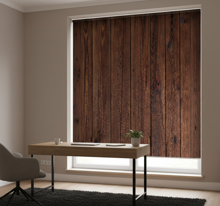 Reference: E6203Transform your workspace with our Blind home office with dark brown rustic wood planks, a stunning design that seamlessly blends elegance with functionality. The rich, dark brown tones of the rustic wood planks create a warm and inviting atmosphere, while the easy assembly and disassembly features ensure that you can maintain a clean and organized environment. This roller blind not only enhances the aesthetic appeal of your home office but also provides essential benefits such as protection from direct sunlight, privacy, and temperature regulation!