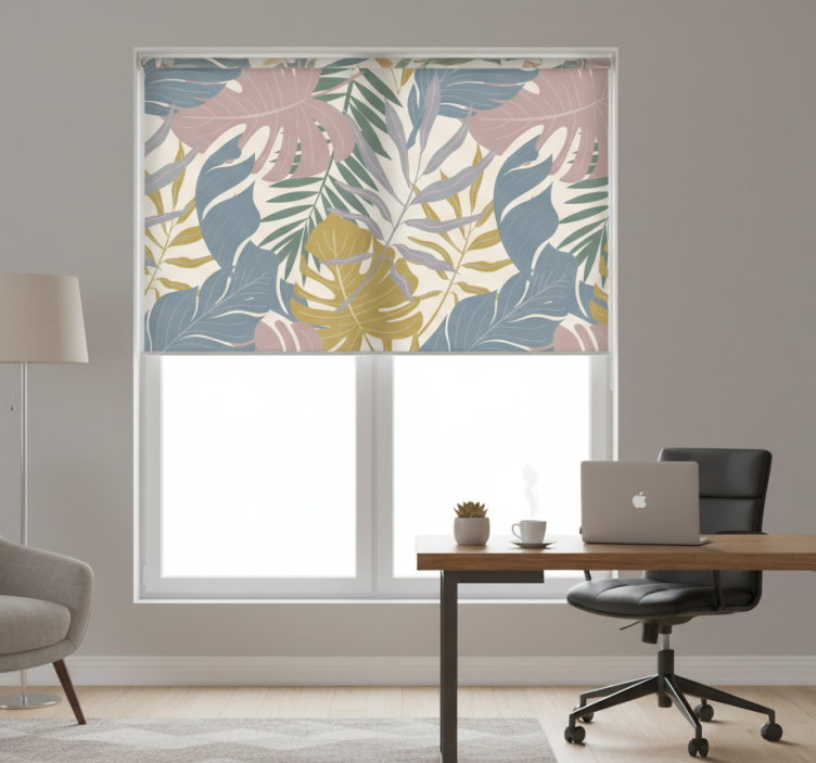 Reference: E6185Transform your workspace with our Blind home office with tropical leaf design, a perfect blend of style and functionality! Featuring a stunning tropical leaf pattern, this roller blind brings a vibrant touch to your home office while ensuring privacy and comfort. With easy assembly in just 2 clicks, effortless cleaning, and a design that protects your space from direct sunlight, this blind is a must-have for anyone looking to elevate their decor.