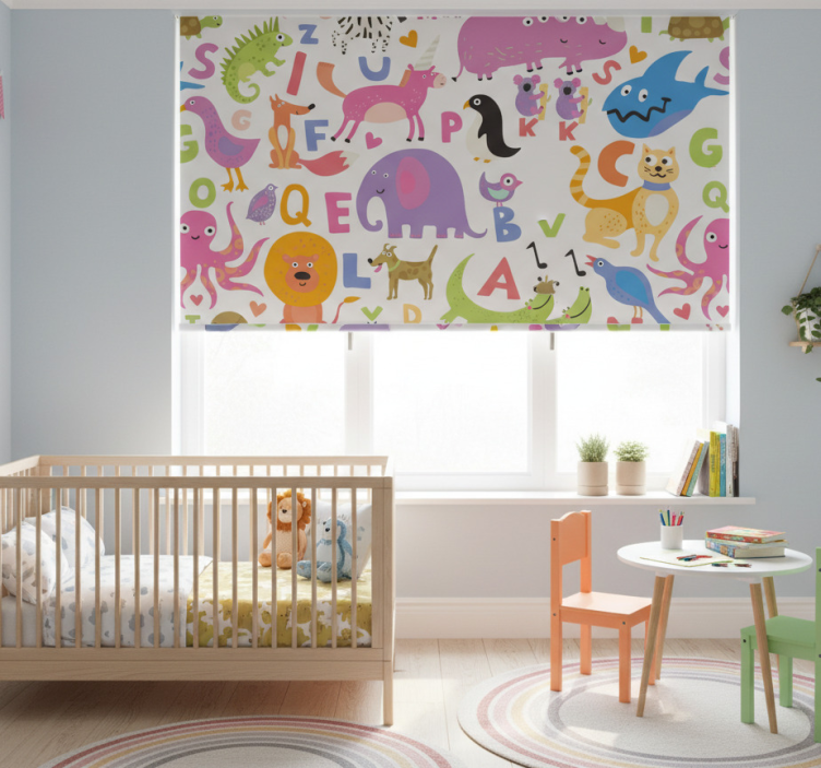 Reference: E6823Introducing our stunning Blind kids alphabet animals roller blind, designed with vibrant colors and playful animal graphics that will capture the imagination of every child! The unique design features a delightful blend of fun alphabet letters paired with adorable animal illustrations, making it not only a functional addition to any room but also a beautiful decorative piece. With easy assembly in just 2 clicks and effortless cleaning, this roller blind is perfect for busy families looking to enhance their children's space!