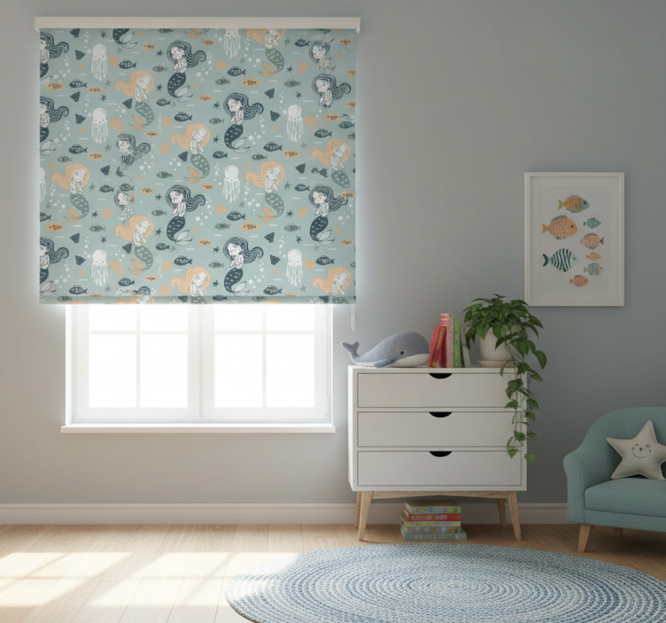 Reference: E6936Introducing the Blind kids blue magic mermaid pattern, a captivating design that brings the enchanting world of mermaids to life! This delightful design features vibrant blue hues and whimsical mermaid patterns, creating a magical atmosphere that will brighten any child's room. With its easy assembly in just two clicks and easy-to-clean material, this roller blind is not only visually stunning but also incredibly practical for everyday use!