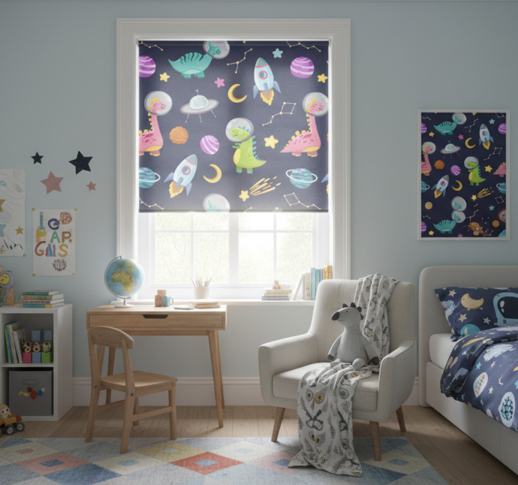 Reference: E7169Introducing our delightful Blind kids cute design spatial dinosaurs roller blind! This charming design features whimsical dinosaurs floating in a captivating spatial setting, creating a fun and imaginative atmosphere for children. The vibrant colors and playful illustrations are sure to engage the little ones while enhancing the overall decor of any room.