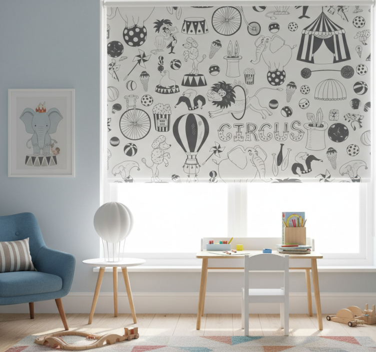 Reference: E7228Introducing the Blind kids nordic color circus, a delightful blend of playful design and vibrant colors! This roller blind features an enchanting circus theme that captivates the imagination, making it perfect for creating a whimsical atmosphere in any child's room. With easy assembly in just two clicks, it is also designed for effortless cleaning and disassembly, ensuring that maintaining a fresh look is a breeze. The blind effectively protects the room from direct sunlight while providing privacy when lowered, allowing for a cozy and secure environment.