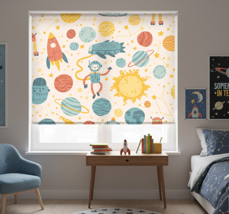 Reference: E7171Embark on a whimsical journey with our Blind kids space adventure scene! This enchanting design features vibrant colors and imaginative graphics that transport children to a galaxy filled with planets, stars, and friendly astronauts. The playful elements are crafted to inspire creativity and joy, making it a perfect addition to any child's room.