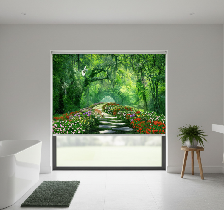Reference: E6158Discover the enchanting world of our Blind trees surreal woodland path roller blind, a stunning design that transforms any space into a mystical woodland retreat. Featuring a captivating blend of vibrant greens and soft browns, this roller blind showcases a mesmerizing forest scene. The intricate details of the trees, combined with the surreal atmosphere, create an ambiance that is both calming and inspiring, perfect for any room in your home!