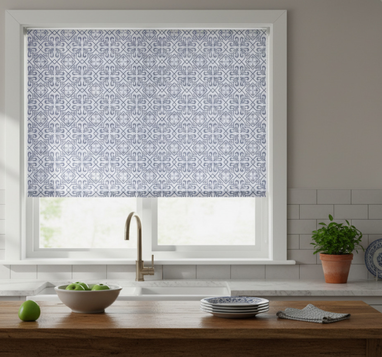 Reference: E6405Transform your kitchen into a captivating space with our Blinds in a kitchen blue octagon portuguese tile design! This stunning roller blind features a vibrant blue octagon pattern inspired by traditional Portuguese tiles, making it a perfect blend of modern aesthetics and classic charm. The design not only enhances the beauty of your kitchen but also offers practical benefits like easy cleaning and assembly in just two clicks. Enjoy the privacy it provides when lowered while letting in just the right amount of natural light!