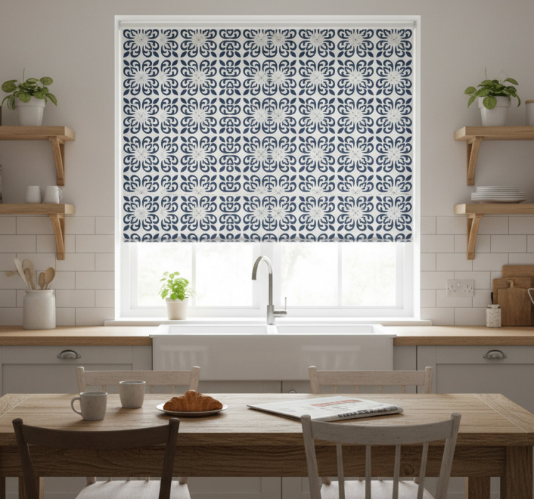Installing the Blinds in a kitchen dark blue clover tile blinds in a kitchen is a breeze with our easy assembly process. In just two clicks, your beautiful new blinds will be ready to use, transforming your kitchen in no time! Cleaning is equally simple, allowing you to maintain a fresh and inviting atmosphere effortlessly.