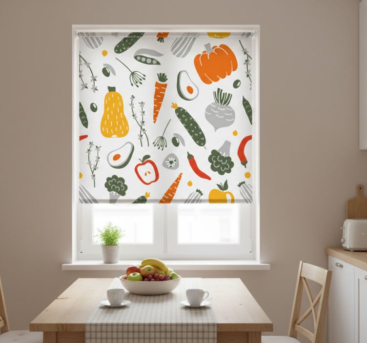 Reference: E6472Transform your kitchen into a vibrant space with our Blinds in a kitchen fruit and vegetable wallpaper 5. This delightful design showcases a lively fruit and vegetable pattern that is both refreshing and inviting, making it the perfect addition to any culinary environment. The colorful graphics not only enhance the visual appeal but also breathe life into your kitchen, creating a warm atmosphere for family gatherings and culinary adventures!