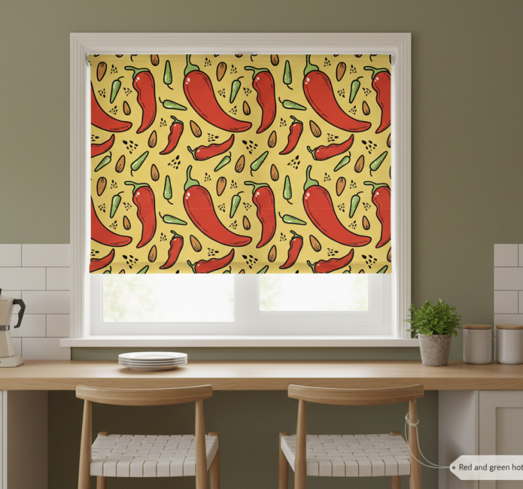 Reference: E6436Introducing our stunning Blinds in a kitchen inspired by red and green chili, designed to bring a vibrant and spicy flair to your culinary space! This roller blind features an exquisite graphic design that beautifully combines the bold colors of red and green chili peppers, creating an energetic and inviting atmosphere. With easy assembly in just 2 clicks, simple disassembly for quick cleaning, and customizable measurements, this product is perfect for any kitchen enthusiast looking to enhance their decor.