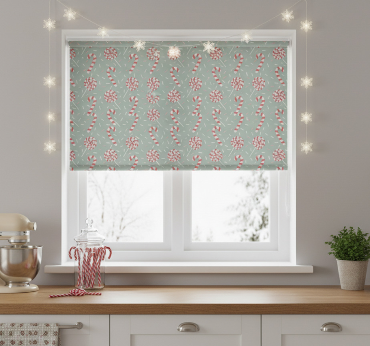 Reference: E6388Transform your kitchen into a festive haven with our Blinds in a kitchen red christmas candy design! This delightful roller blind features vibrant red hues and whimsical candy patterns, perfect for adding a cheerful touch to your home decor. The unique design not only enhances the aesthetic appeal but also provides functionality, making it an ideal choice for those looking to combine style and practicality.