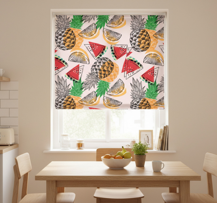 Reference: E6502Transform your kitchen into a vibrant oasis with our Blinds in a kitchen summer print pineapple. This delightful design showcases a lively pineapple motif set against a backdrop of refreshing summer colors, bringing a touch of tropical charm to your space. The playful graphics and bright hues create an inviting atmosphere that perfectly complements any kitchen decor!