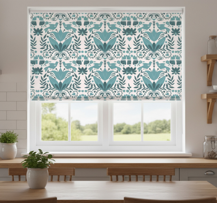 Imagine stepping into a kitchen adorned with our Blinds in a kitchen with blue bird folk art pattern blinds in a kitchen. These blinds not only elevate the decor but also inspire joy and creativity. The cheerful blue birds evoke a sense of freedom and nature, perfect for brightening up your culinary space. Enhance your kitchen's aesthetic while making it a welcoming environment for family and friends!