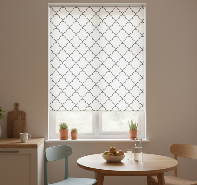 Reference: E6359Elevate your kitchen's ambiance with our stunning Blinds in a kitchen with geometric moroccan design. This exquisite design features intricate geometric patterns inspired by traditional Moroccan art, creating a unique visual appeal that blends elegance with a modern touch. Its vibrant colors and shapes are perfect for adding personality to your kitchen space, allowing you to express your style through functional decor! Our roller blinds are easy to clean, provide privacy when lowered, and protect the room from direct sunlight while ensuring a regulated room temperature.