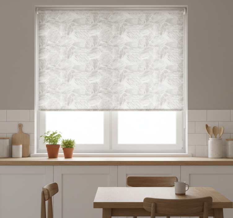 Transform your space with our Blinds in a kitchen with gold marble hexagonal design blinds in a kitchen. This stunning design elevates the aesthetic of your kitchen, infusing it with modern elegance and charm. Imagine hosting friends and family in a beautifully decorated kitchen where every detail reflects your exquisite taste. These blinds not only enhance your kitchen's style but also provide a practical solution for light control and privacy, making them the perfect decorative element!