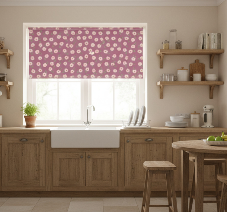 Elevate your home decor with our Blinds in a kitchen with little pink daisy pattern blinds in a kitchen. The cheerful daisy design brings a sense of joy and freshness, making your kitchen more inviting. Imagine cooking and entertaining in a space that reflects your personality and style! These blinds are not just functional; they are a delightful addition that enhances the overall ambiance, effortlessly combining beauty with practicality.