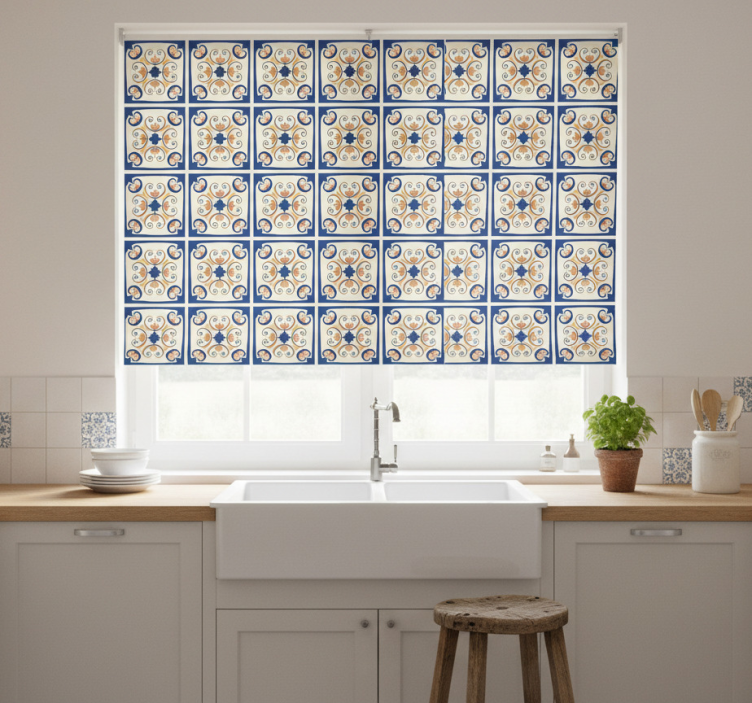 The Blinds in a kitchen with pink flowers portuguese tile blinds in a kitchen are not just functional; they are a statement piece! These blinds infuse your kitchen with personality and warmth, making your cooking space feel inviting and cheerful. Their beautiful design enhances the overall decor, creating an inspiring environment for culinary adventures. Let the charm of Portuguese tile art lift your spirits every time you enter your kitchen!