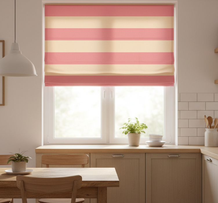 The Blinds in a kitchen with pink horizontal stripes blinds in a kitchen are more than just a functional item; they are a statement piece! Their cheerful design adds a splash of color that can brighten up any kitchen. Imagine cooking in a space that feels both stylish and comfortable. These blinds not only improve the aesthetics of your kitchen but also allow you to regulate room temperature and enhance security, letting you see outside without being seen. Let your kitchen reflect your personality with these fabulous blinds!