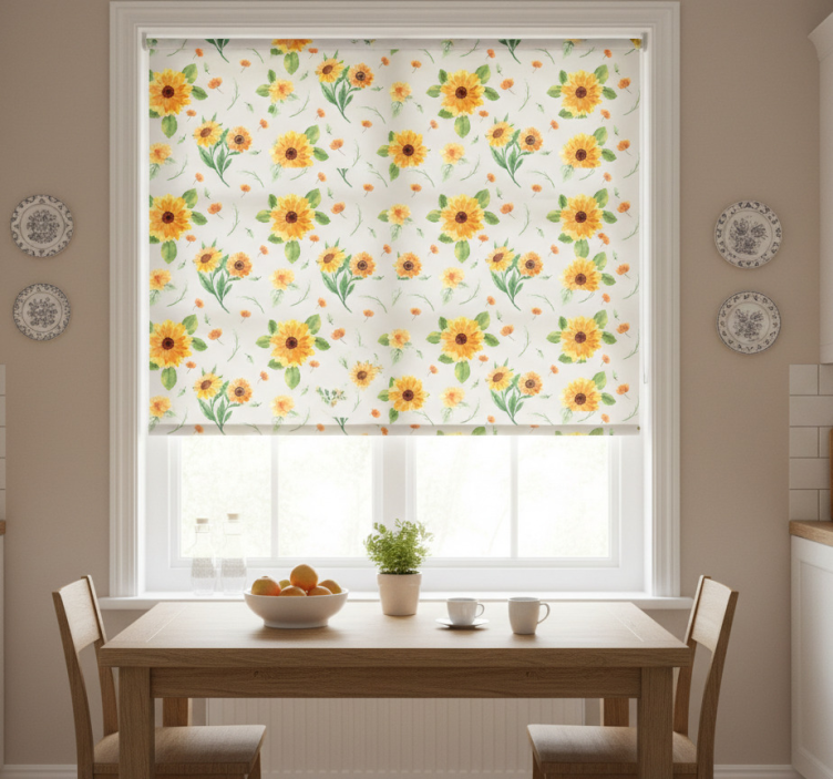 Blinds in a kitchen with sunflower watercolor pattern