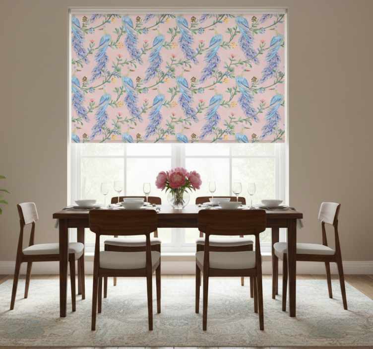 Dining room blind birds in pink paradise
