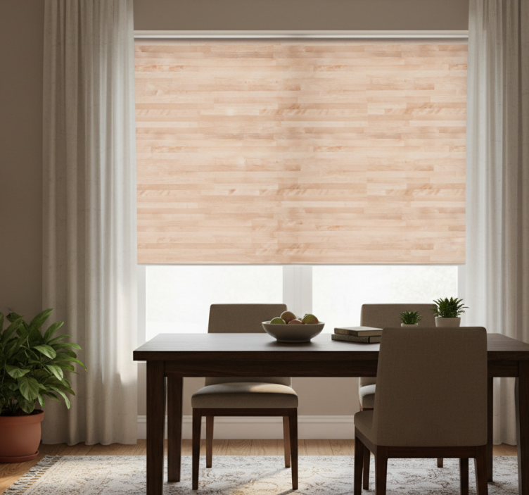 Reference: E6558Introducing our stunning Dining room blind in elegant brown wood finish, designed to elevate the aesthetic of your living space! This elegantly crafted blind features a rich wood finish, easy assembly in just two clicks, and easy cleaning for your convenience. Its innovative design protects your room from direct sunlight while providing a sense of privacy when lowered. The roller blind also allows you to regulate the room temperature, enhancing comfort while ensuring security by letting you see outside without being seen.