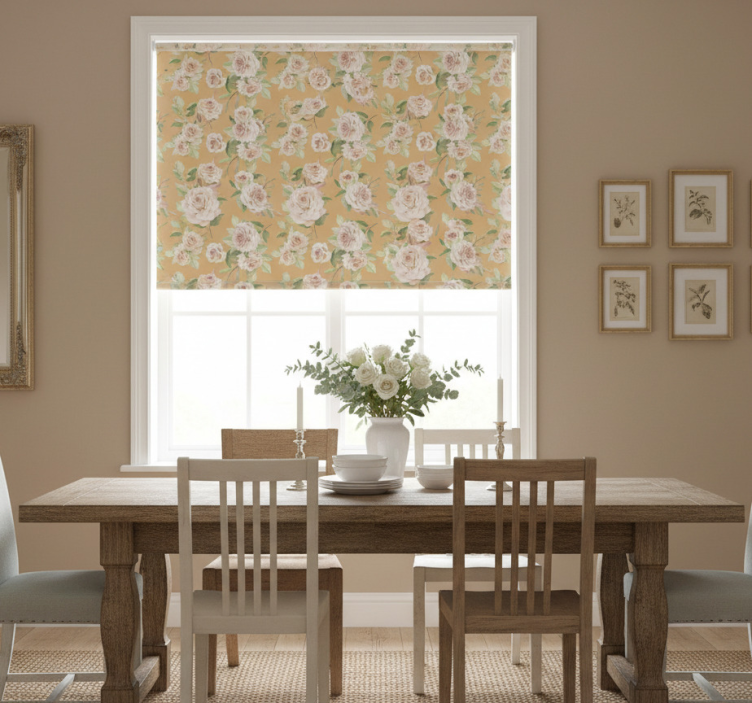 Reference: E6585Transform your living space with our stunning Dining room blind in french provincial roses pattern. This exquisite design features a delicate floral motif that evokes the charm of traditional French decor, making it perfect for adding a touch of elegance to your home. The intricate roses are beautifully intertwined, creating a harmonious blend of color that enhances any dining area. With easy assembly in just two clicks, easy cleaning, and the ability to regulate room temperature while ensuring privacy, this roller blind is as functional as it is beautiful!