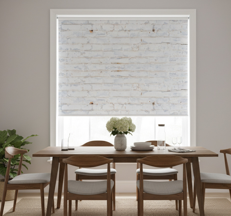 Discover the enchanting appeal of the Dining room blind in white brick pattern with worn paint dining room blind. This beautiful roller blind enhances your home decor by adding a touch of warmth and sophistication. Picture a cozy dining area bathed in soft, filtered light, where friends and family gather around the table. The unique brick design works harmoniously with various interior styles, making it a versatile choice for any homeowner looking to elevate their space.