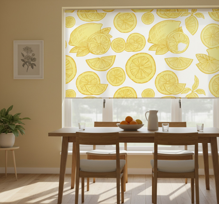 Reference: E6730Introducing our stunning Dining room blind orange and lemon design, a delightful addition to your home decor! This vibrant design features a playful pattern of oranges and lemons, bringing a fresh and cheerful ambiance to your dining area. With easy assembly in just 2 clicks, this roller blind is not only visually appealing but also highly functional. It is easy to clean and disassemble, ensuring that you can maintain a pristine environment effortlessly. Additionally, it protects your room from direct sunlight while providing privacy when lowered. This innovative design helps regulate room temperature and enhances your home's security, allowing you to see outside without being seen. Perfectly customizable, it caters to your unique style and needs!