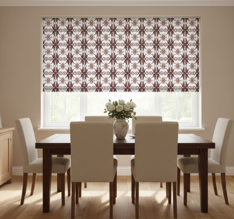Reference: E6563Introducing our stunning Dining room blind original design damask style, a perfect blend of elegance and functionality! This unique design features intricate damask patterns that create a sophisticated atmosphere in any dining room. The beautiful graphical elements are complemented by the blinds' practicality, including easy assembly in just two clicks, effortless cleaning, and quick disassembly that allows for maintaining the window and its surroundings with ease. Not only does this blind protect the room from direct sunlight, but it also provides privacy when lowered and helps regulate the room temperature, enhancing your comfort and security.