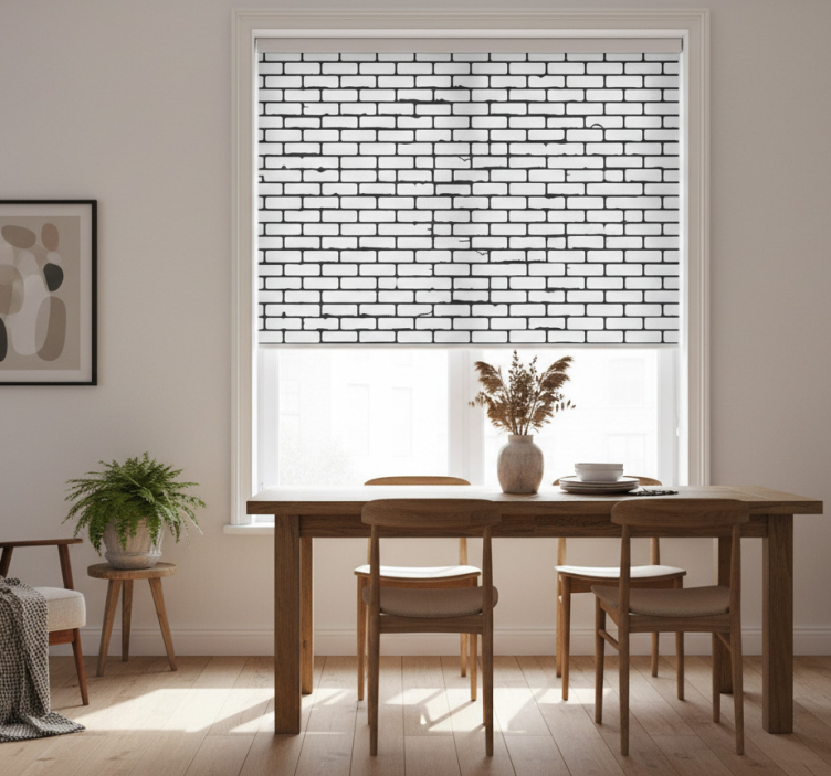 Reference: E6685Transform your living space with our Dining room blind with an aged white brick pattern, a stunning addition that beautifully combines style and functionality. This roller blind features an elegant aged white brick design that brings a rustic charm to any interior while offering easy assembly and disassembly in just two clicks. Not only is it simple to clean, but it also protects your room from direct sunlight, providing you with privacy when lowered. Enjoy a comfortable atmosphere as it helps regulate your room temperature and enhances security, allowing you to see outside without being seen.