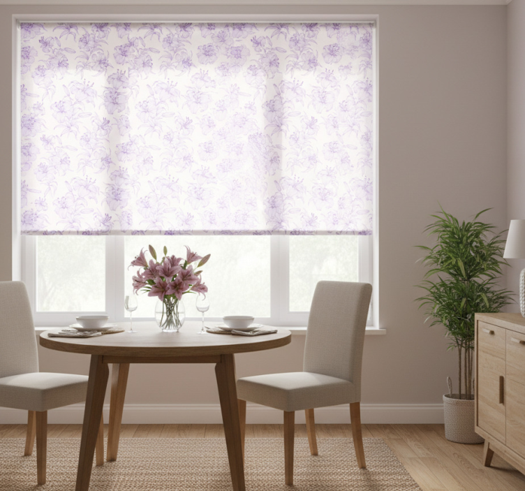 Reference: E6555Transform your living space with our Dining room blind with blooming lilies design, a stunning blend of beauty and functionality. This visually striking roller blind features elegant blooming lilies that gracefully cascade across the fabric, creating a refreshing and tranquil atmosphere. The design not only adds a touch of sophistication but also serves practical purposes, such as protecting your room from direct sunlight while enhancing your home's overall décor.