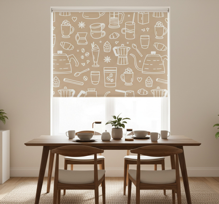 Dining room blind with coffee cups and glasses pattern