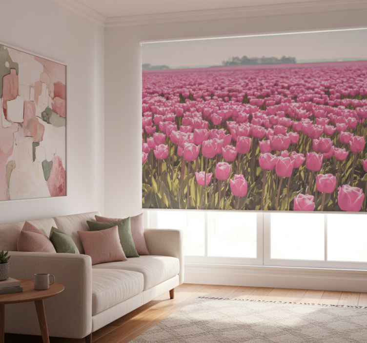 Reference: E8945Transform your living space with our stunning living room blind in a field of pink tulips. This beautiful design captures the essence of spring with vibrant pink tulips set against a serene backdrop, bringing a refreshing touch to any room. The roller blind features easy assembly and disassembly in just two clicks, making it a breeze to clean and maintain. It effectively protects your room from direct sunlight while providing the perfect amount of privacy when lowered. With 100% customizable measurements, you can tailor it to fit your windows perfectly, ensuring that your home remains stylish and secure.