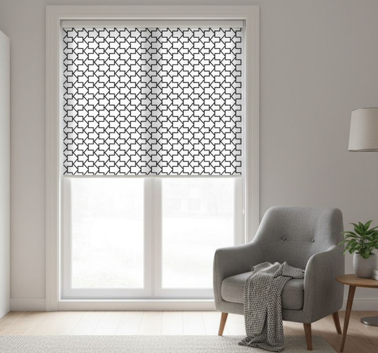 Reference: E7650Introducing the Modern blind geometric arrows black lines pattern, a stunning design that features a captivating geometric arrow motif intertwined with sleek black lines. This roller blind not only enhances the aesthetic of any room but also serves practical purposes. Its modern blind design is perfect for those who want to elevate their space, making it an ideal choice for contemporary interiors.