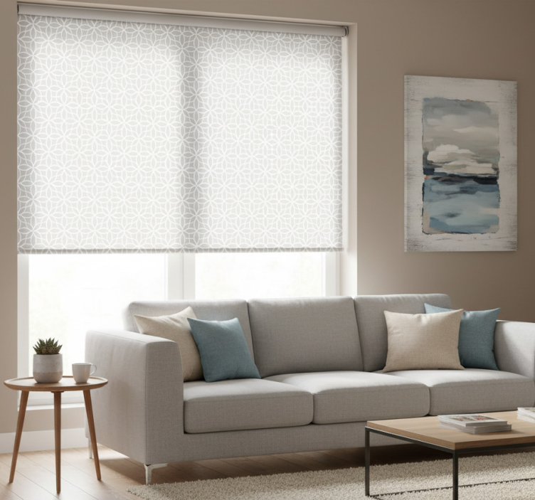 Reference: E7829Introducing our Modern blind in gray and white geometric design, a stunning addition to any space! This roller blind features a sleek geometric pattern that beautifully balances the modern aesthetics of gray and white. With easy assembly in just 2 clicks, effortless cleaning, and the ability to disassemble just as quickly, this blind is designed for convenience. It not only protects your room from direct sunlight but also provides essential privacy when lowered. The unique design allows for room temperature regulation and enhances the overall security of your home by allowing you to see outside without being seen. Plus, it's customizable to your needs with three different textures available to suit your desired light and privacy levels!