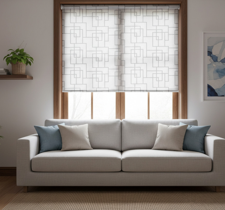 Reference: E7607Transform your living space with our Modern blind in gray geometric lines, a stunning addition that beautifully combines style and functionality. Featuring a unique geometric design in a sophisticated gray hue, this roller blind not only enhances your decor but also offers practical benefits. Its easy assembly and disassembly in just two clicks make it a breeze to install, while its easy-to-clean surface ensures that maintenance is simple. Enjoy a cooler room during hot days as this modern blind effectively protects against direct sunlight, providing you with the perfect ambiance!