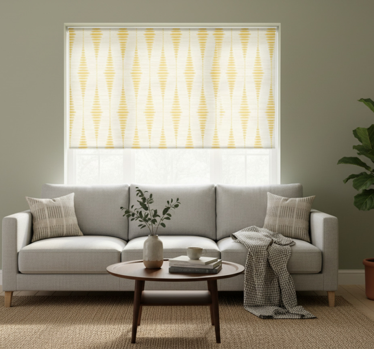 The Modern blind in yellow rabaul ikat design modern blind is the perfect choice for decorating your home. It instantly elevates the ambiance, making any room feel more inviting and stylish. Imagine the warm glow of the yellow fabric illuminating your space while the ikat design adds a touch of cultural elegance. This blind not only beautifies your interiors but also enhances comfort by regulating room temperature and providing a sense of security. Transform your home into a cozy retreat with this fabulous blind!