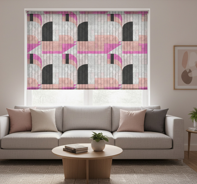 Reference: E7627Transform your living space with our Modern blind with abstract shapes on bricks, a stunning blend of contemporary design and practical functionality. This roller blind showcases a unique pattern of abstract shapes set against a brick-like backdrop, creating an eye-catching focal point that complements any decor. The design is not only visually appealing but also features easy assembly in just two clicks, effortless cleaning, and a quick disassembly process that allows for swift window maintenance. Enjoy the benefits of blocking out direct sunlight while maintaining privacy and regulating the room temperature.