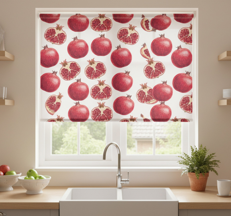 Reference: E6280Transform your kitchen into a vibrant oasis with our Pomegranate bounty blinds in a kitchen. This exquisite design features an enchanting pomegranate pattern that embodies elegance and charm, seamlessly blending functionality with aesthetic appeal. The roller blind not only protects your space from direct sunlight but also provides a remarkable touch of style to your decor. Enjoy the ease of use with our easy assembly and disassembly features, allowing you to maintain a pristine environment effortlessly!