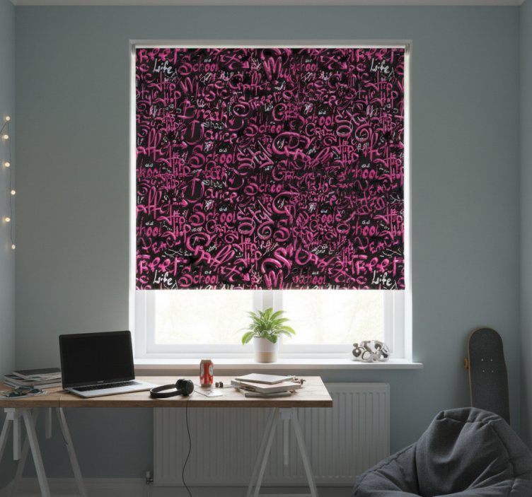 Reference: E7512Introducing the Teenage blind in pink and black graffiti, a vibrant addition to any room that combines artistic flair with functional design. This roller blind features a stunning graffiti-inspired pattern in bold pink and black hues, creating an energetic atmosphere that perfectly aligns with youthful tastes. Its easy assembly and disassembly in just two clicks make it a practical choice for busy households, while also enhancing the room's decor.