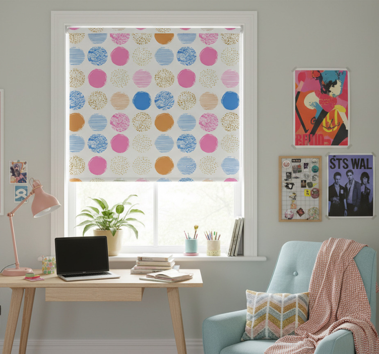 Reference: E7502Transform your space with our Teenage blind with colorful dot pattern! This vibrant design features an array of playful dots in various hues, creating a lively atmosphere that perfectly complements any teenage room. The Teenage blind with colorful dot pattern is not only stylish but also functional, offering easy assembly and disassembly in just two clicks. It's easy to clean, protects your room from direct sunlight, and ensures privacy when lowered, making it an ideal choice for any teen's haven!