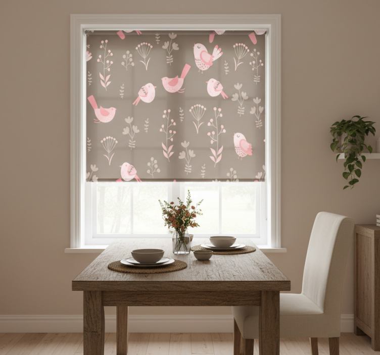 Reference: E6697Transform your space with our Vintage pink birds dining room blind, a stunning piece that brings a touch of elegance to any dining area. This beautiful roller blind features a delightful design of vintage pink birds, surrounded by soft floral patterns that create an inviting atmosphere. With its easy assembly in just two clicks and effortless cleaning, this blind not only enhances your room's aesthetic but also offers practical benefits. Protect your space from harsh sunlight while maintaining your privacy, all while enjoying the versatility of 100% customizable measurements!