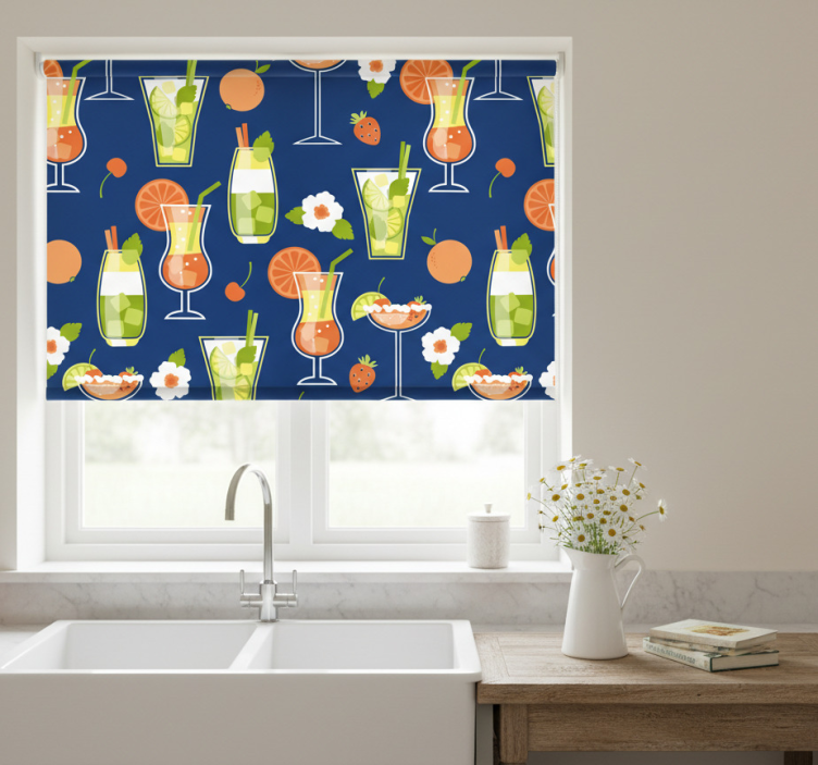 Reference: E6498Introducing our stunning Vintage style blinds in a kitchen with cocktails! These exquisite roller blinds feature an elegant design that seamlessly blends retro charm with modern functionality. With easy assembly, easy cleaning, and a perfect fit for any window, they enhance your kitchen’s ambiance while offering privacy and light control. The unique textures available allow you to customize your blinds according to your desired light and privacy levels, making them an ideal choice for any kitchen setting.