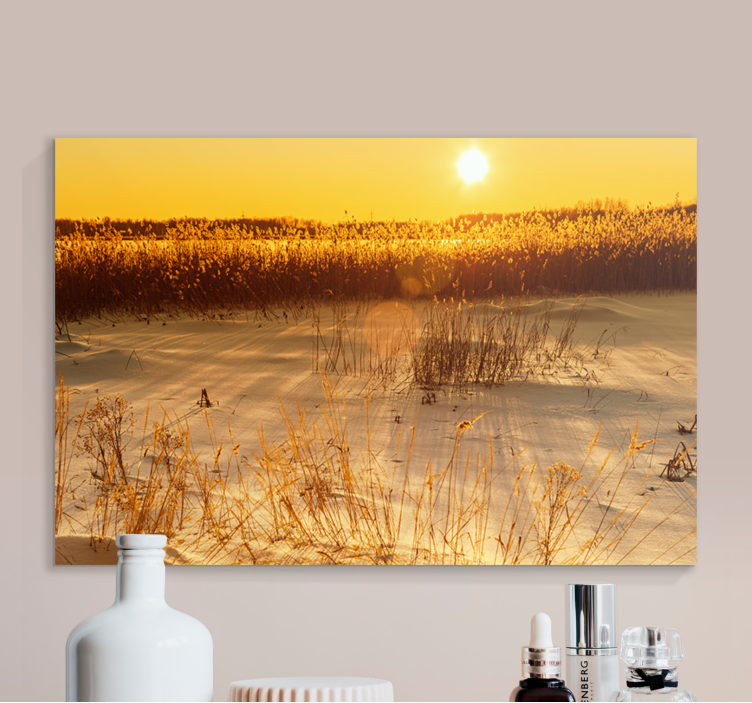 Experience the breathtaking beauty of nature with our Golden sunrise landscape landscape canvas. This stunning artwork features an enchanting scene of pampas grass swaying gently in the wind, illuminated by the warm embrace of a sunset. The vibrant yellow hues of the sun reflect off the grassy fields, creating a serene atmosphere that brings the essence of the outdoors into your home. The design invites you to immerse yourself in the tranquility of nature, making it a perfect addition to any space.