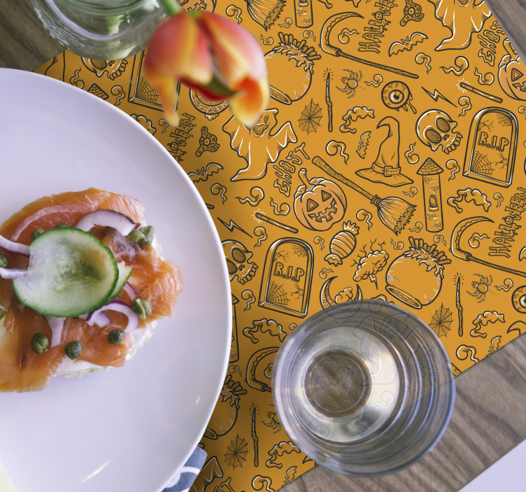 Get ready to elevate your Halloween celebrations with our Halloween placemats with creepy halloween designs! Each placemat features a vibrant pattern that brings together playful ghosts, eerie skulls, grinning pumpkins, creepy spiders, and haunting tombstones against a backdrop of striking orange. Perfect for setting the mood at any Halloween gathering, these designs encapsulate the spirit of the season and ensure your table looks festive and fun!