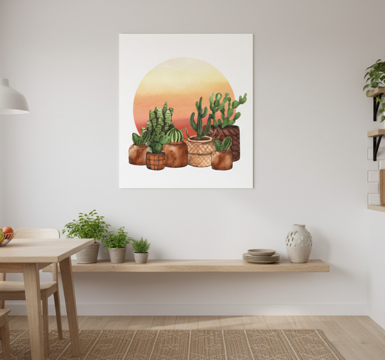 Reference: G657Introducing our stunning Kitchen poster cactus with sunset in circle, a vibrant piece of art that beautifully combines the serene imagery of a sunset with the unique silhouette of a cactus. This poster showcases a captivating design featuring high colour intensity, a semi-matt finish without reflections, and a robust 180g/m2 grammage that makes it ideal for any modern kitchen setting.