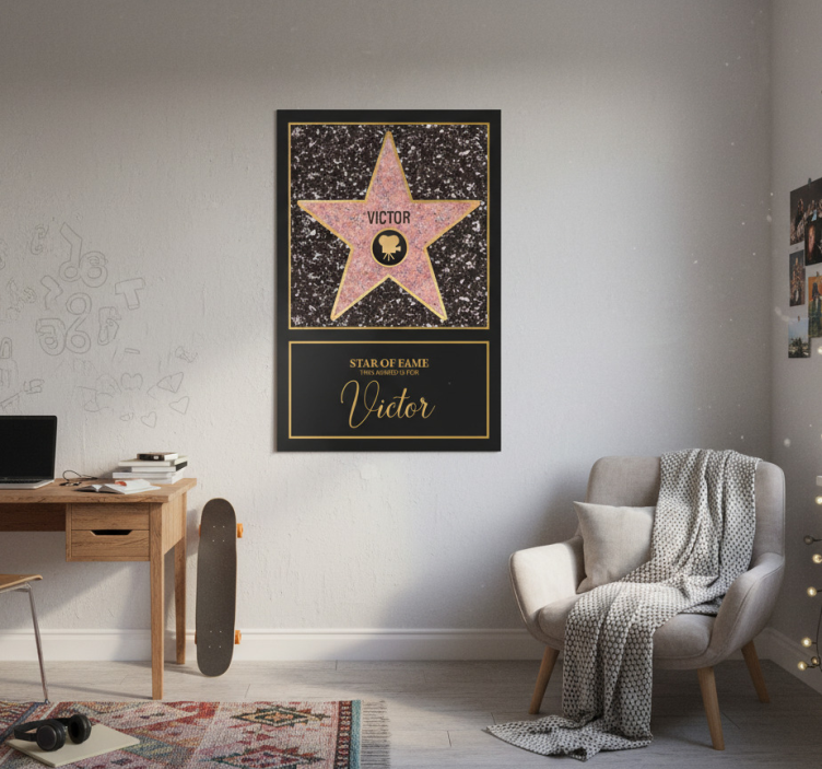 Reference: G759Introducing our stunning Living room poster custom star of fame, a beautifully designed piece that celebrates your unique style. This poster boasts a 180g/m2 grammage for an ideal weight, a semi-matt finish that prevents reflections, and high colour intensity that brings life to any space. Perfect for adding a touch of glamour to your home!