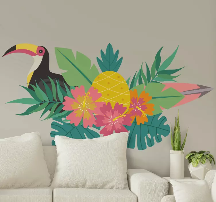 Transform your living space with our stunning Animal wall sticker tropical bird design, featuring a vibrant array of tropical leaves, colorful flowers, and an enchanting toucan perched near a delightful pineapple. This design captures the essence of a lush paradise, bursting with greenery and vibrant colors that breathe life into any room. Perfect for creating a cheerful atmosphere, this wall sticker is ideal for nature lovers and anyone looking to add a splash of color to their home!