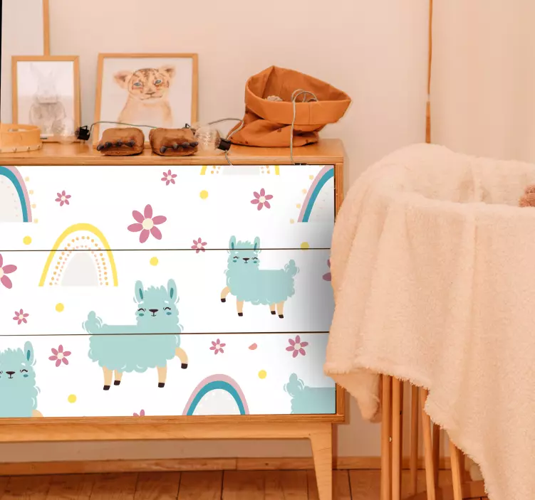 Introducing our Cat sticker charming llama design, featuring an enchanting illustration that brings together playful llamas, vibrant rainbows, and delightful flowers in a colorful pattern. This eye-catching design is perfect for anyone looking to add a touch of joy and whimsy to their living space. The llamas are beautifully drawn, creating a friendly atmosphere that complements any piece of furniture!